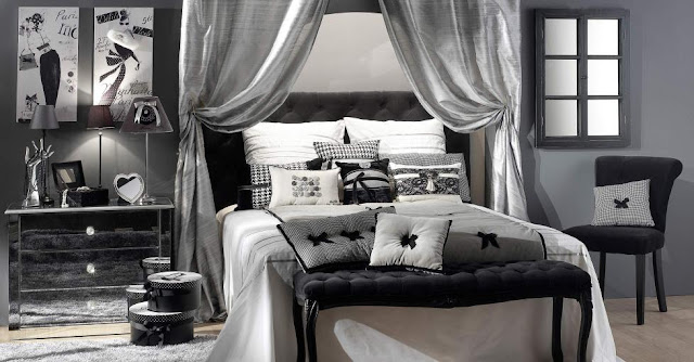 with velvet pillows, intriguing black laces and mirrors shining even on the table